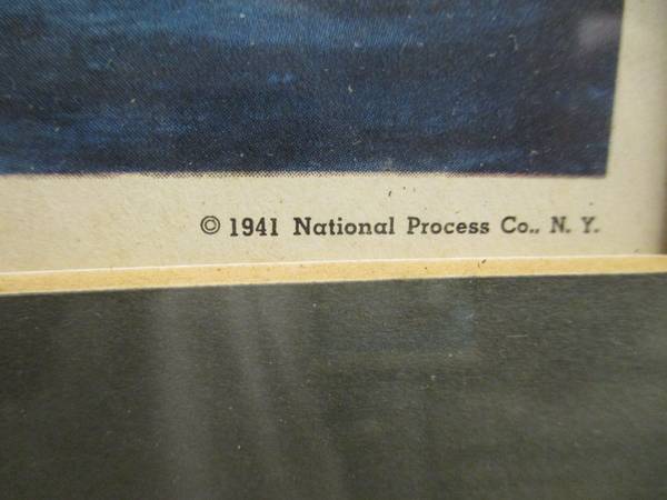 This piece was produced in 1941 and it does show signs of age including folds and creases as shown in the photos, it still presents very well. It comes framed and matted behind glass. The wood frame does show some scuffs and wear but the glass and matting look good. I am asking $40.00 cash firm for this rare awesome piece. TEXT or email are best show contact info