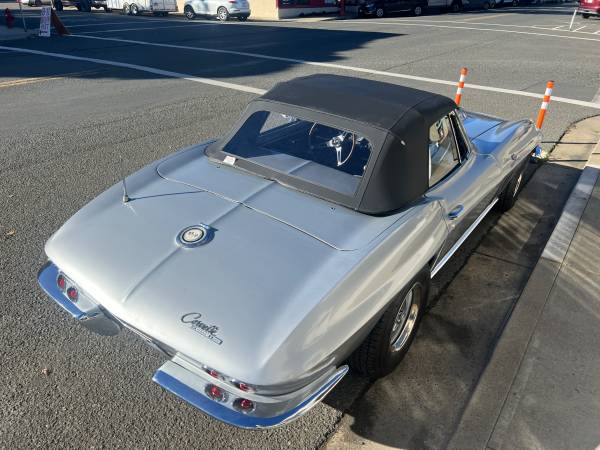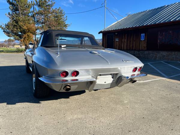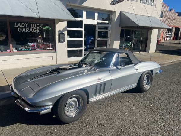 Well kept California 65 Corvette Roadster. Factory built as a Red on Red Fuel Injected car. Now Silver on Black car with a fresh 396 Big Block - Muncie M22 4 Speed and 411 geared Posi Rear Differential (what a combo!). Nice set of 15" Rally Wheels. All new bushings and suspension front & rear. Brand new tires. Brand new pro installed soft top. Great looking driver quality lacquer paint. Straight body and clean chassis. Good glass and brightwork. Really fun car! Great running and sounding Stingray in amazing condition.
