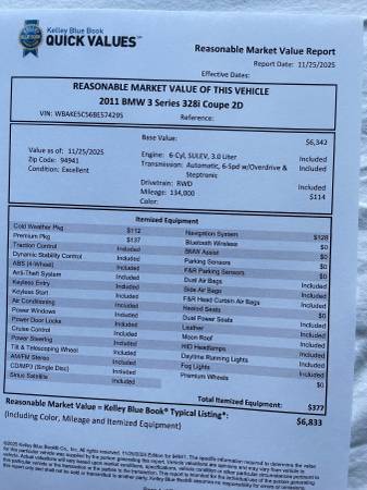 Clean title. ONE owner and driven only 8k LOW MILES a year. SULEV 6 cylinder ( Low Emission Vehicle ) Well equipped Premium Package includes Bluetooth, Moonroof, Parking assist sensors, heated power Leather seats and much more. Fresh service including new brakes, new tires and wheel alignment, new front struts, detailed and ready to deliver its new owner many miles of smiles. Looks and drives GREAT. Priced to sell BELOW MARKET VALUE so call Darryl to make it yours today, 4I5.9I6.99O6, I am always happy to assist. We are a by appointment only DMV licensed dealer / new vehicle broker with thousands of satisfied customers over decades of doing good honest business in Marin County. For your security and convenience all DMV titles are completed in the comfort of our San Rafael office.