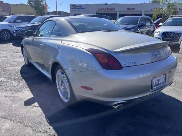 is proud to present this exceptional vehicle!?? **2002 Lexus SC SC 430 Convertible 2D - RWD**Experience performance, comfort, and reliability in this 2002 Lexus SC.Equipped with a 8-cylinder V8, 4.3 Liter, Automatic transmission, and RWD system, it's built to handle your daily drives and weekend adventures with ease.---**?? Vehicle Highlights** Mileage: 104,529 Engine: V8, 4.3 Liter, Gasoline, 300 HP Drivetrain: RWD Exterior Color: Silver Interior Color: Black Body Style: Convertible VIN: JTHFN48Y120031997 Stock #: Lex1997---**?? Pricing** Price: $$12,995 Ask about financing options. We work with all credit types.---**? Features & Options**Power Door Locks, Air Conditioning, Dual Air Bags, Power Steering, CD/MP3 (Multi Disc), Cruise Control, Premium Wheels, Mark Levinson Sound, AM/FM Stereo, F&R Side Air Bags, Dual Power Seats, RWD, Telescoping Wheel, Rear Spoiler, Cassette, Traction Control, Power Windows, Automatic, Navigation System, Leather, DVD System, ABS (4-Wheel), V8, 4.3 Liter---? **We Make Car Buying Simple**All vehicles are inspected, serviced, and ready to drive.Trade-ins welcome Financing available