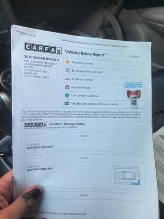 Hello today I am selling my 2010 Nissan Roque. I bought it a couple months ago for 6k I have not drove it very much because I have another car. It gets around 24 mpg on highway good daily commuter for families. I replaced the oxygen senor already myself but check engine light turned back on. It should be an easy fix. I kept the car nice clean and tidy and I will make sure the car goes to a responsible new owner. I have a temporary title for the car so you would need to fill out the transfer application with me so you can get yourself a title. Car was already smogged but I can smog it again if you want before you buy it ill even pay for it. The tags are just expired im pretty sure so once you put in ur name the dmv will give you tags for the next year all you need is the transfer application and smog. I will go as low as 3k its a good car with decent miles I wanna see it in good hands. Everything else in the car works. Clean title. You can come by and take a look at it Im usually always home. Also there is a dent on the front bumper idk how that got there cause I bought it like that. Ive been involved with 0 accidents with this vehicle
