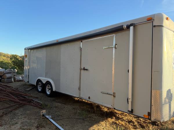 I'm selling my 24 foot Hallmark brand interior enclosed box trailer. It's 102 inches wide (O/S) and features a ramp door, beavertail, and big side door. The trailer has a side awning, E-tracks, and a roof vent, as well as an electric tongue jack and electric brakes. It's equipped with a 2-5/16 hitch ball and has three new tires, plus a Bargeman electric connector, 2 axle. The trailer is light grey in color.