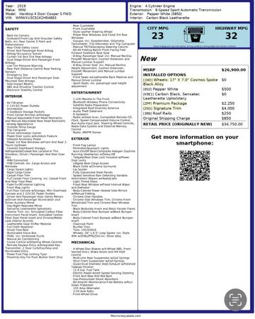 Get ready to experience the thrill of driving with this sporty 2019 MINI Hardtop 4 Door S. This peppy little powerhouse is ready to hit the streets in style, boasting a sleek Pepper White exterior that's sure to turn heads. Under the hood, you'll find a punchy 2.0L 16V Twin Power Turbo engine that delivers an exhilarating driving experience, perfect for zipping through city streets or cruising down the highway.