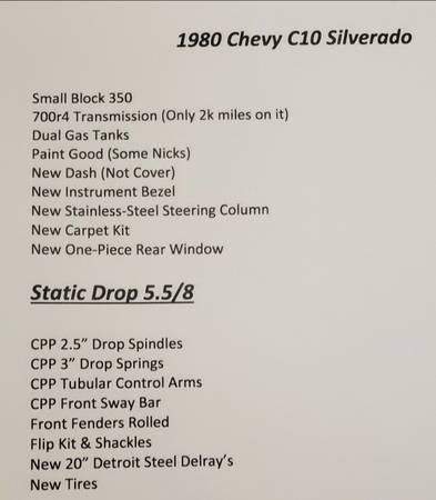 I have a 1980 Chevy C10 for sale, super clean not many like this around. No rust and the body is straight, paint is very good but not show quality. The truck runs strong with lots of upgrades listed, no AC. Asking 25K well worth it, come see for your self. Call or text Al show contact info