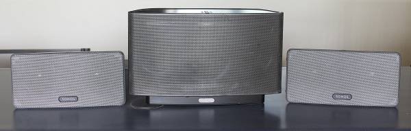 Three Sonos speaker bundle. 2x Play 3 and 1 Play 5. All grouped together. Amazing sound quality.