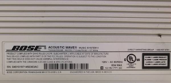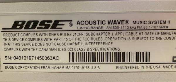 This is a Bose Acoustic Wave Music System ll, with AM/FM and CD player. Works and sounds fine. The Bose Acoustic Wave Music System was made for many years with various features and improvements during its production. This was one of the last ones made.