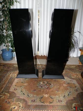 For Sale - Pair of Carnegie Acoustics Model CST-1 Floor Standing Loudspeakers in Piano Black. Includes BG Neo Planar Magnetic Tweeter with Two 5.25" Woofers in a D' Appolito configuration. Tall, Slender cabinet with sloped back design and quasi-transmission line interior design tuned to 44Hz. . Rear ported. Grills are magnetically attached.