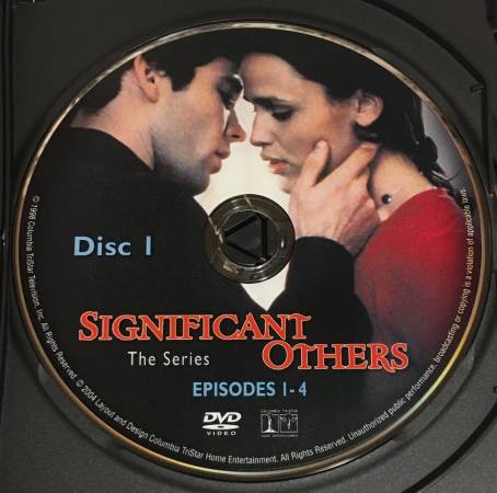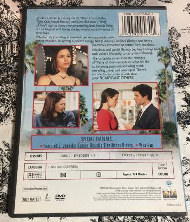Selling a used but in good working condition Significant Others The Series DVD featuring Jennifer Garner, Scott Bairstow, Eion Bailey, Michael Weatherly and Elizabeth Mitchell. This Series came out in 1998 and was released on DVD in 2004 it's a 2 Disc DVD and is 274 min. long. If you have any questions or interested email me with your contact info and I will get back to you. DVD is available for shipping if needed