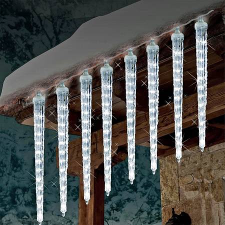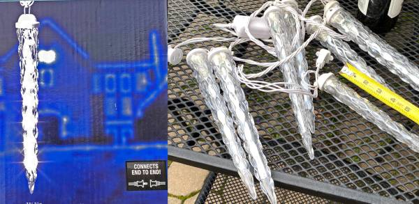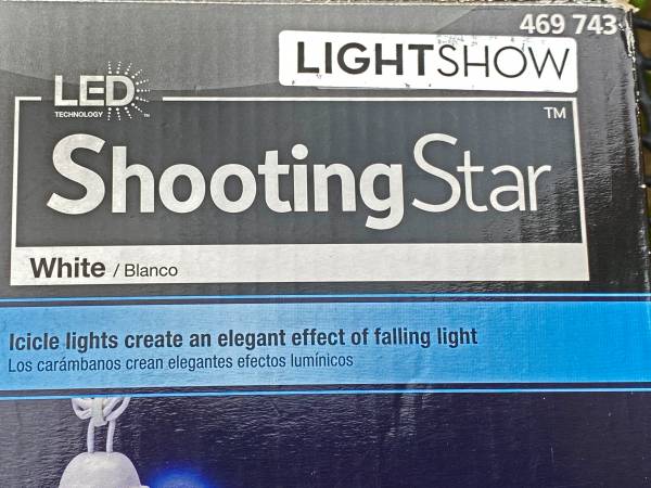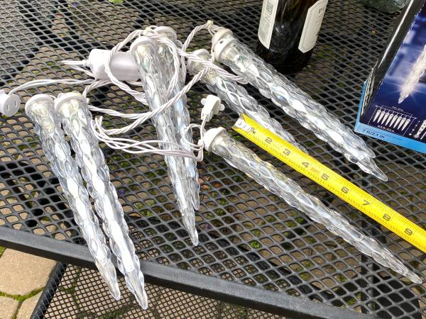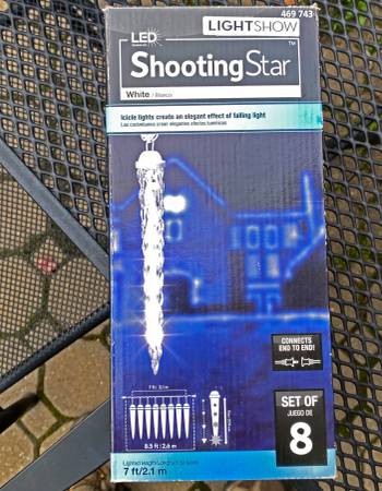"Shooting Star" Icicle Lights, LED. Timed to twinkle in downward cascade, randomly every ~2 seconds, such that several are always cascading. Each icicle is 11" long. Cord is 8ft long, with lighted length 7ft. Good for porch, gate overhead, window, etc. Lightly used, like new condition.