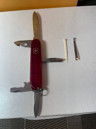 Knife (Large Size) Number 1: Large knife, smaller knife, bottle opener, can opener, phillips , screwdriver, puncture knife, tweezers, toothpick and keychain option ($21) - In good condition!