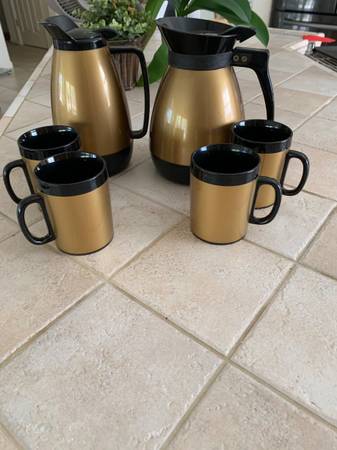 Made in USA, only use them couple times, almost new. The pot keep tea or coffee warm and juices or milk cold. Can use them for breakfast, lunch, dinner, evening snack, and more. Good condition.