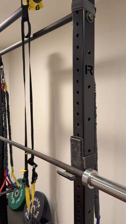 Rogue monster rack in good condition. INCLUDING: fat/skinny pullup bars - land mine press attachment - safety spotter arms - band pins & J-cups. bar and weights are negotiable if needed.