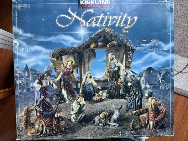 Ten figures: Jesus, Mary, Joseph, Three Kings, an Angel, a shepherd boy, a donkey, and a camel
