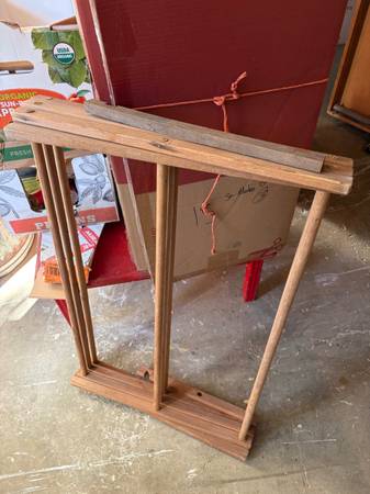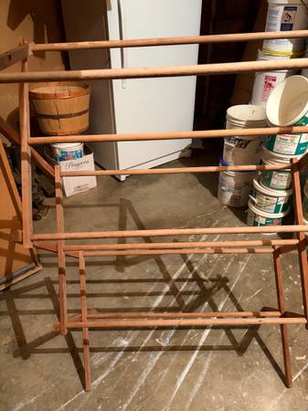 Wooden, collapsible clothes drying stand. Opened, the stand is 36” wide, 18” deep and 50” high. Collapsed, it is 36” wide, 24” high and 5” deep. Very portable.