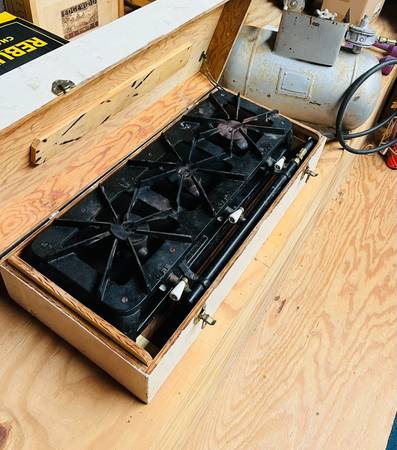 Three burner propane stove with custom made wood case and propane tank. New rubber hose, in excellent working condition This is a great item for your camping trip or at home .... especially when you...