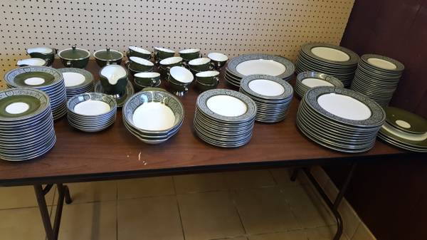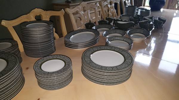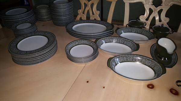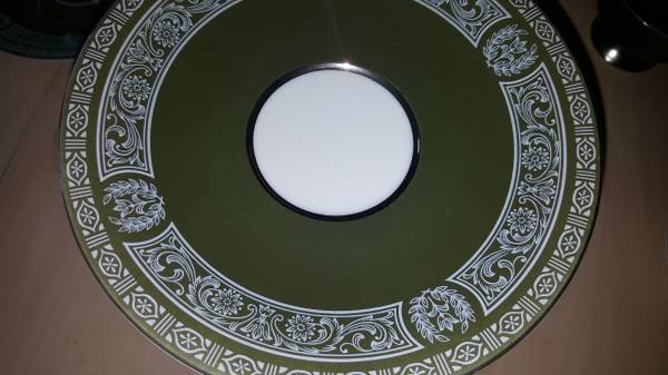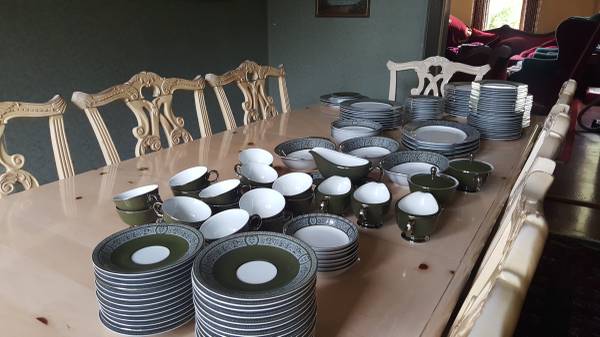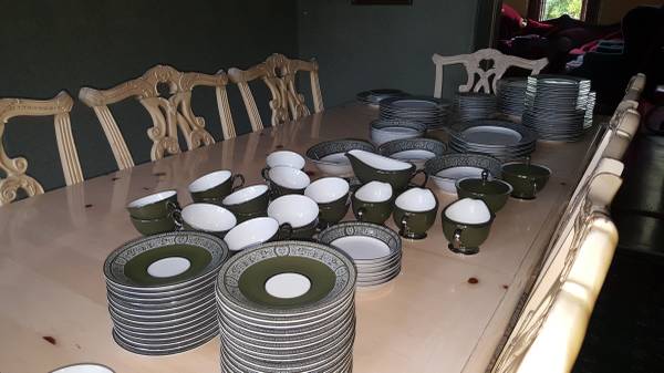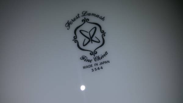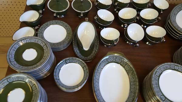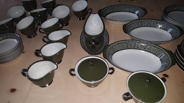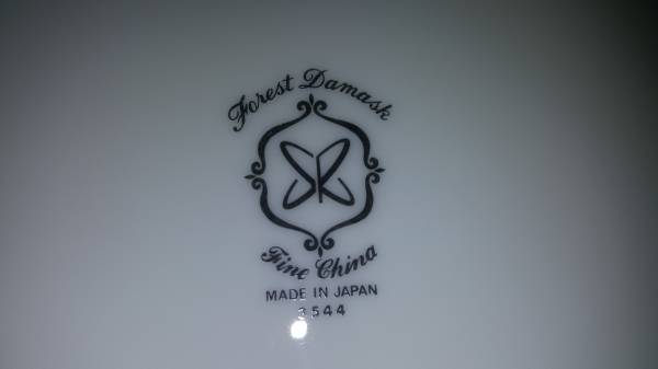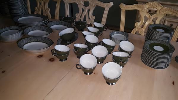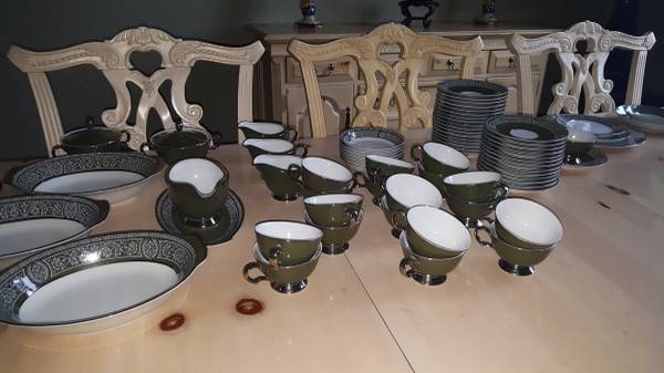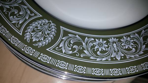 Very large, fine porcelain set of "Forest Damask China". MADE BY FINE CHINA OF JAPAN made in 1970 to 1979 in Japan for Sears: having broad green stylized borders with fired gold silver trim and highlights; Pattern #3544. Includes: