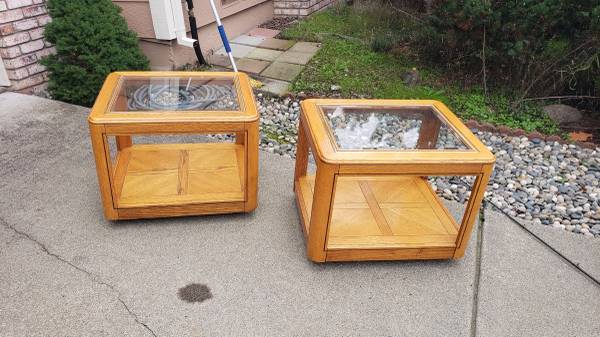 2 Beautiful End tables: New owner can keep them in the "Golden Oak" or could even Spray Paint them "Black" or any other color to fit their decor. Both tables disassemble and reassemble for Easy Transport. If interested just let me know Thanks Greg show contact info