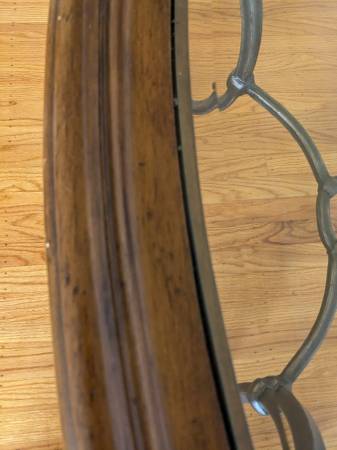 Oval coffee table. Thick, heavy piece of glass sits on a wood and metal base. Measures 50 by 30 and approx. 21 inches high.