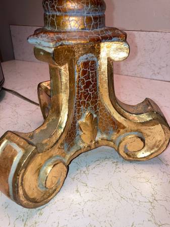 Rare size. Larger than it looks in photo. It is a stunning hand carved, Italian gold guilded table lamp. 37" tall. I am also selling a French antique gold guilded wall mirror, that goes very well with this lamp. Ask if interested.