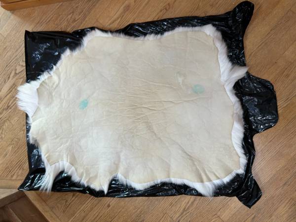 2 Natural Reindeer Hide - Pelts from Iceland Icelandic Reindeer Hide (one with blue stamps) measures about 33" x 42-43". Icelandic Reindeer Hide (one with black tag still on) measures about 16-32" x...