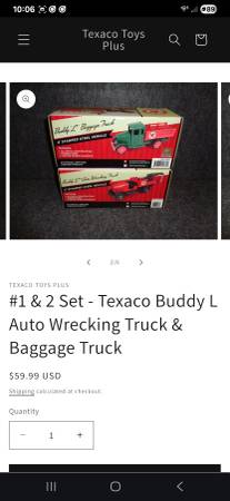 Selling my Texaco diecast model vehicle collection. Most are new in the box. The ones out of the box are in like new condition. Some are coin bank vehicles as well. If it's a coin bank vehicle it has the original key that comes with it. Selling as a lot or I'll consider selling individually. Some of these are hard to find & out of stock on the Texaco website. Retail from the Texaco website currently is $1,200 for the lot. I'll entertain offers on the lot or individual models. Email, text or call if interested, thanks.