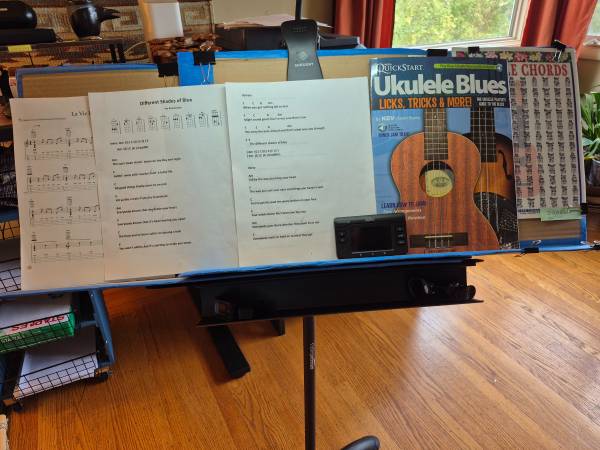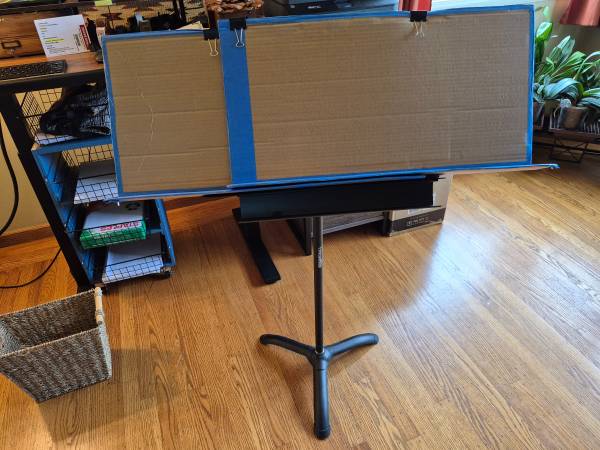 My stand also comes with my very own homemade cardboard desk extender (photos 2 & 3) - stable enough to hold music books, binders, etc. Cardboard extender breaks down for storage and can, of course, be recycled if you don't use it. $20 for everything.