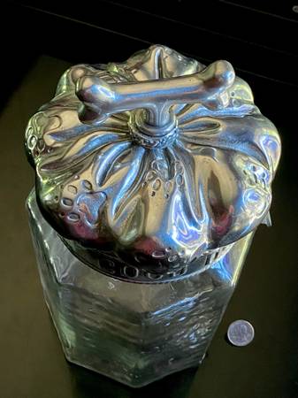 ARTHUR COURT "GOOD DOG" Treat Jar w/cast aluminum lid is collectible now - it’s been retired from ARTHUR COURT catalog. Octagonal glass jar w/lid measures 13" H x 6" W. Whimsical honeycomb-textured octagonal jar alone stands about 8-1/2” H; it holds about 1-1/2 cartons (24 oz.) of medium-size biscuits. Polished aluminum lid stands 4” H w/dog bone-shaped handle and w/’Good Dog’ cast into the lid ‘collar.’ Star-shaped charm tag ‘Good Dog’ hangs from lid. Lid has a plastic gasket to maintain freshness of contents. Glass has hallmark ‘Arthur Court’ in block lettering and in script, and ‘Copyright 2002’ on underside of jar. Glass is dishwasher-safe but NOT aluminum lid - hand-wipe with damp cloth. Collectible as it is, being retired, hard to find, is great for personal pet or for gifting another dog-lover. It’s available for local pick-up in San Rafael, with cash, Venmo, or PayPal.