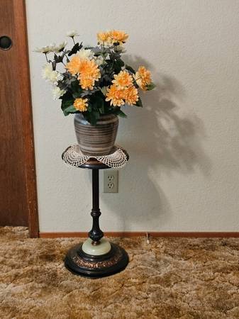1940'S ANTIQUE STANDING ASHTRAY OR USE AS A PLANT STAND.... COPPER WITH MARBLE ACCENT STANDS AT 21" TALL REMOVEABLE AMBER GLASS ASHTRAY VERY GOOD CONDITION...MISSING A HANDLE $225.00 CASH