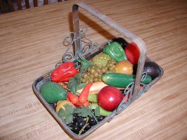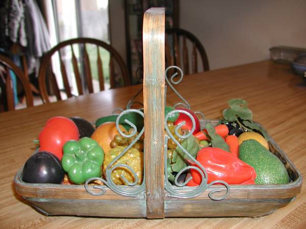 GREEN BASKET FILLED WITH ARTIFICIAL FRUIT ADD FLAIR TO ANY KITCHEN/DINING ROOM REDUCED TODAY FROM $20.00 $15.00 CASH