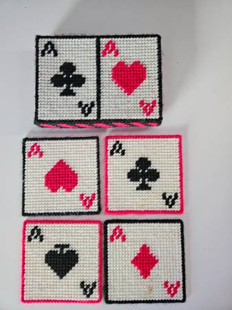 MAKE IT A GAME NIGHT WITH MATCHING ACCESSORIES CARD BOX HOLDS 2 DECKS OF PLAYING CARDS 4 MATCHING COASTERS THEMED WITH THE CARD SUITS HANDMADE USING PLASTIC NEEDLEPOINT ONE OF A KIND $20.00 CASH