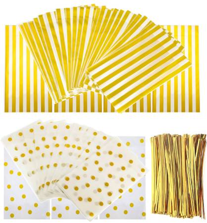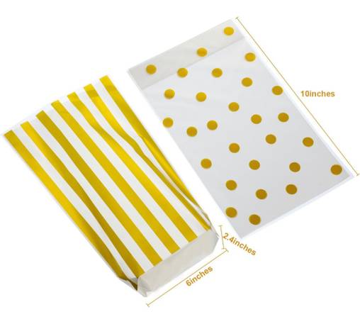 I am selling 88 polka dot and 105 striped gold and white party bags. Very sturdy, well made, classy look. They were used at a wedding and I no longer need the left overs.