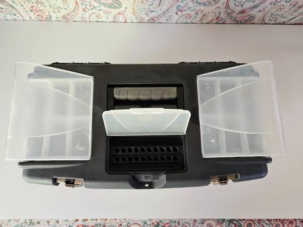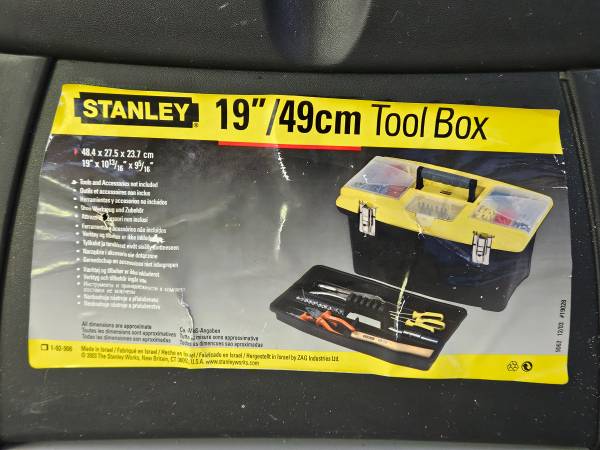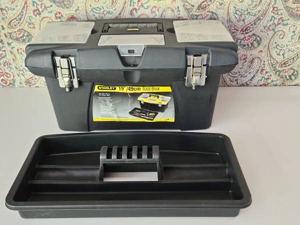 STANLEY 19" TOOL BOX HAS REMOVEABLE INSIDE TRAY AND 3 TOP SMALL REMOVEABLE ACCESSORIE BOXES NEVER USED NEW CONDITION $20.00 CASH...REDUCED FROM $25.00 ON 7/13/2025