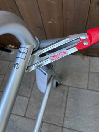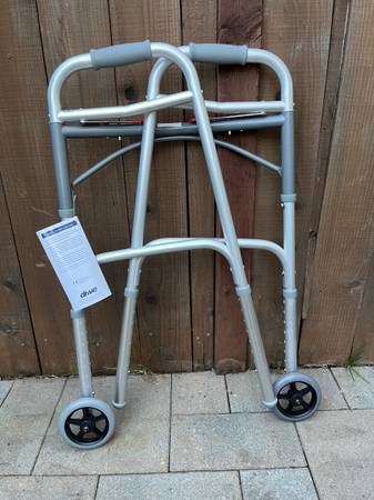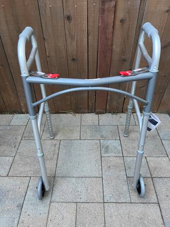 Adjustable height. Used indoors a couple of times. Sturdy aluminum construction. Easily fold and unfold the walker with the dual push-button design, operable by fingers, palms, or side of hand. 5”...