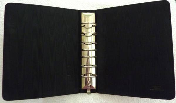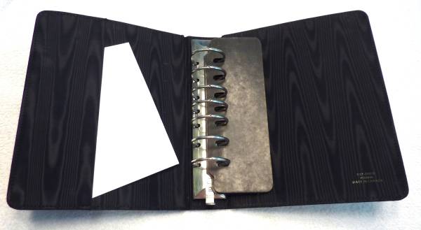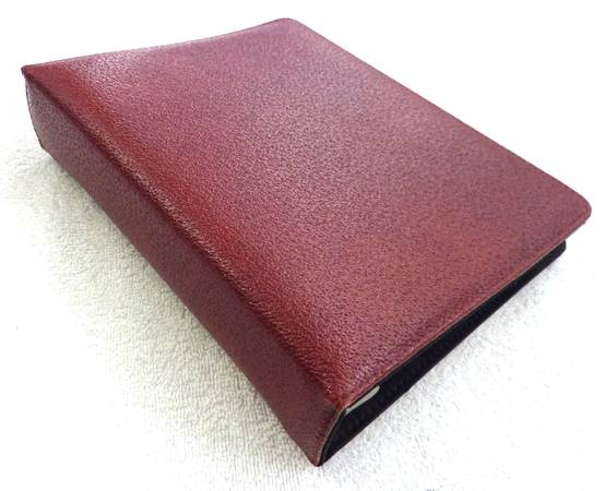 This deep red pig skin leather Day-Timer is an open binder with seven 1 5/8” rings and a pocket on the back of the front cover. It can be used with Day-Timer pages, ½ page notes, or sketch pages. It has never been used and is in mint condition. It was made in Canada and measures 9 ½” x 7 ¾”.