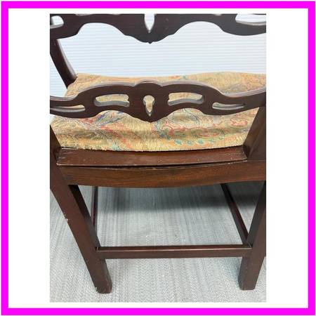 Design Plus Gallery presents a 19th Century Chippendale TripleBack Settee. It features a distinctive pierced ribbon back design, curved arms, and an upholstered seat covered in a colorful paisley fabric. The elegant frame is constructed from solid mahogany with carved details and a rich finish The settee is supported by eight legs with stretchers. In good condition, visible wear on the finish and minimal wear from antique age.