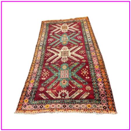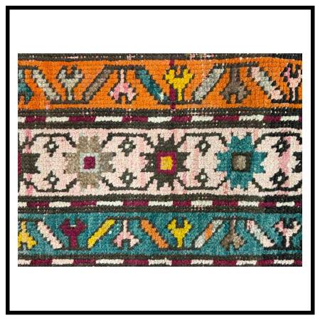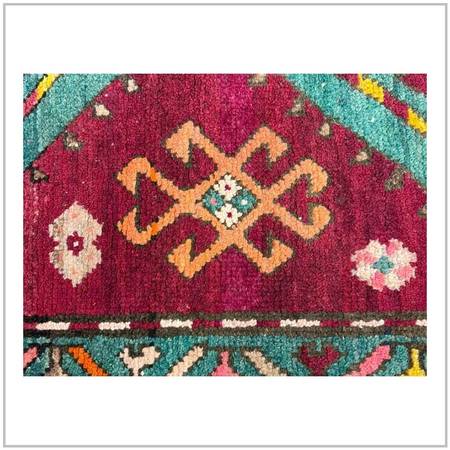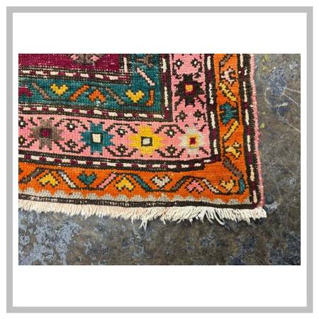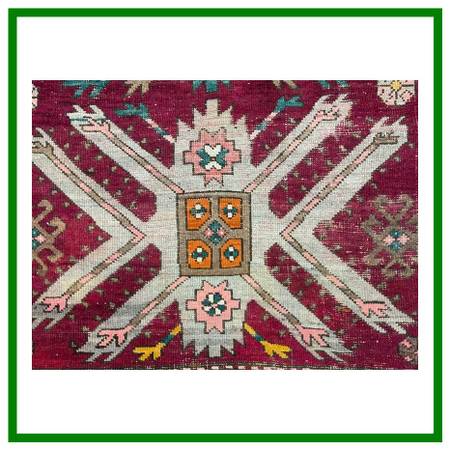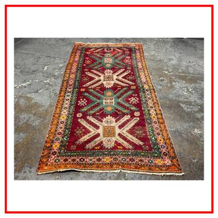 Design Plus Gallery presents the 4ft 8in x 10ft Anatolian Style Area Rug. The hand knotted rug has vibrant colors with geometrical pattern work. The most dominate color is a redcoral with X shapes in the center in turquoise + off white. Varying colors in the multiple border with emblems placed all around for a thoughtful design that is forever striking. The vintage rug is in good condition for its age with wear that could be mended with a good cleaning.