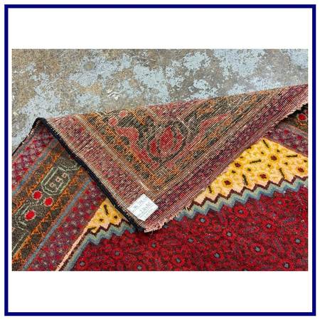 Design Plus Gallery presents an 4ft 8in x 7ft 6in Armenian Ichevan Style Area Rug. The exquisite blend of beauty with contemporary luxury is found in this area rug. Handknotted in Turkey in the 20th Century the rug has a central floral motif surrounded by an intricate border patterns. The has tones of burgundy red with green in the centerpiece, with saffron yellow at the corners, finished with multiple repeating borders in similar colors placed with the centerpiece. Is in good condition with minimal visible wear for its vintage age + use.