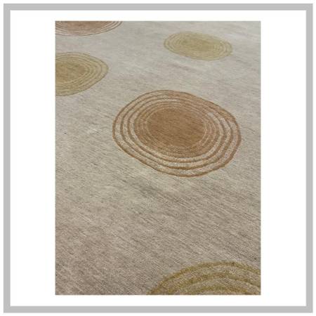 Design Plus Gallery presents a Nepalese Area Rug of Neutal Tones with Fun Pattern Work from Warp Weft. The medium sized 6ft x 9ft rug is of hand made wool pile from Nepal. Light tan background with gold + amber concentric circles floating around the rug in varying sizes. Is in good overall condition with minimal signs of wear for its usage.