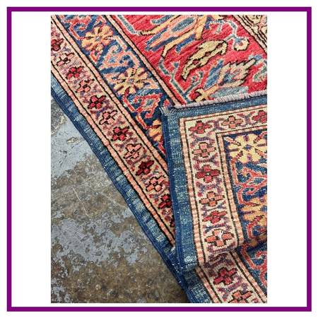 Design Plus Gallery presents a 9ft 3in 12ft Hand Knotted Persian Wool Area Rug. A lively blend of reds, blues, and ivory tones creates a dynamic composition, framed by layered borders filled with detailed geometric and botanical accents. Hand knotted from wool, this rug offers durability and texture suited for everyday placement while still providing visual depth and artistry. Slight fading from sun exposure. It is in good condition, with visible and minimal wear from usage.