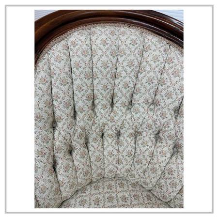 Design Plus Gallery presents an Antique Victorian Balloon Back Sofa. The charming sofa offers an upholstery of pink flowers with green flowering branches against an ivory background to enchant you. The entirety of the sofas chamber has upholstery built into the frame, that also has carved floral elements. There is light surface wear with small snags to the fabric however we feel that this parlor sofa is in good condition for its age and use.