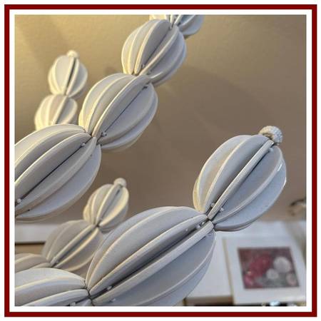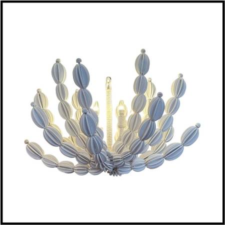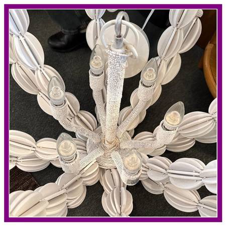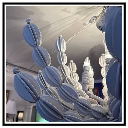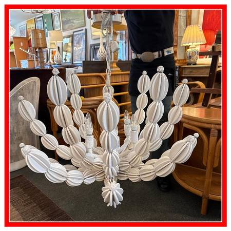 Design Plus Gallery presents the Indi Small Chandelier from Arteriors Home. The light fixture has southwest inspiration that meets unconventional design. A white iron foundation is encased by a matching white wood, carved in a cactuslike arrangement. Each arm has been embellished with clusters of coco shell, a detail that further plays up its perennial inspiration. The unique shape slightly conceals six bulbs that brilliantly illuminate a space, while working in tandem with the design to create an even more brilliant shadow play. The fixture is in good condition for its overall usage.
