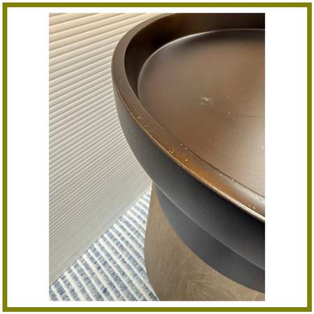 Design Plus Gallery presents the Brady Side Table by Brownstone Furniture. This versatile side table seamlessly integrates into any space, providing both style and functionality. Its minimalist design and practical features make it an aesthetically pleasing addition to any room. The tables metal top is finished in a rich bronze hue, complemented by the Fogfinished teak base. Light surface wear is consistent with age and use. Made in Indonesia.