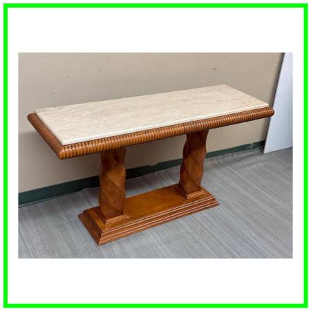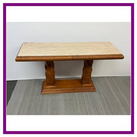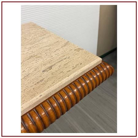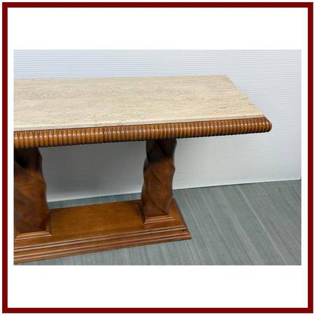 Design Plus Gallery presents the Grand Tour Collection Console Table from Century Furniture. The console has a warm, honey brown tone of wood with visual interest at every angle. The lower base has a molded edging with two twisting pedestal columns that give rise to the travertine top. The wood surrounding the stone surface is twisting and ribbed. The style has been discontinued by the brand. The console is in good condition with minimal wear for its age + use.