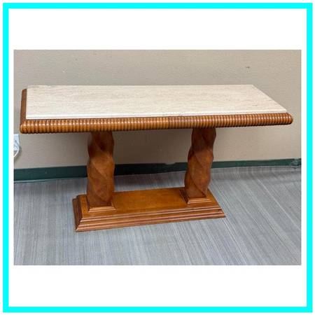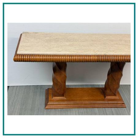 Design Plus Gallery presents the Grand Tour Collection Console Table from Century Furniture. The console has a warm, honey brown tone of wood with visual interest at every angle. The lower base has a molded edging with two twisting pedestal columns that give rise to the travertine top. The wood surrounding the stone surface is twisting and ribbed. The style has been discontinued by the brand. The console is in good condition with minimal wear for its age + use.