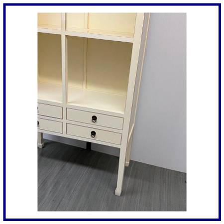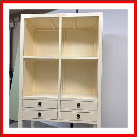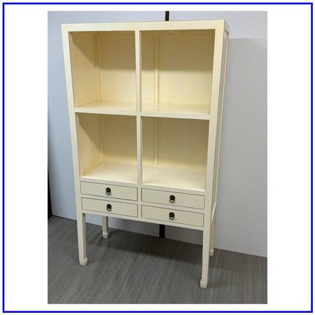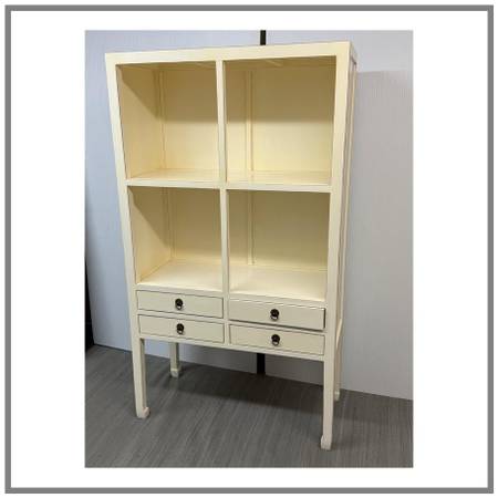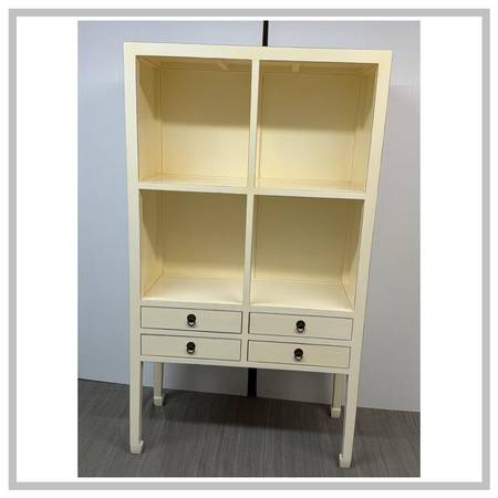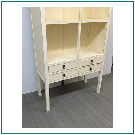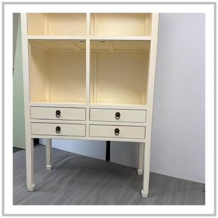 Design Plus Gallery presents a Chinoiserie Zen Ivory Finish Bookcase. A refined union of Chinoiserie charm and Mingera elegance, this bookcase is crafted from elmwood and finished in a soft ivory that accentuates its clean, architectural lines. The upper section presents four wellproportioned cubbies, ideal for showcasing books, ceramics, or curated objects. Below, four drawers offer discreet storage to keep the silhouette serene. Set on four slender legs that culminate in classic Ming curved feet, it stands with a graceful, elevated presence, bringing quiet sophistication to living rooms, studies, and entryways alike. In good condition, visible and minimal wear from usage.