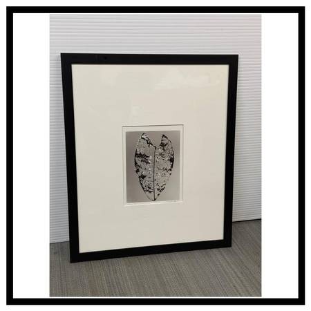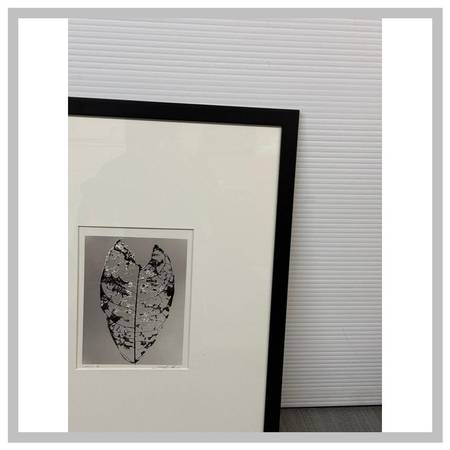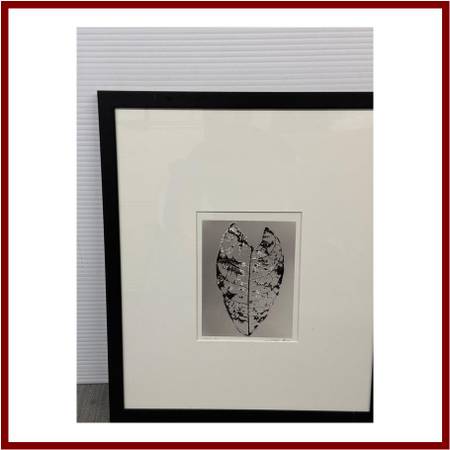 Design Plus Gallery presents Jamaica Ltd Ed Print by Stefano Masseis. This art works is an image of a leaf through a lens of an xray. It is presented as a limited edition print + framed within a black frame with a white mat. The print showcases a detailed structure of a leaf, captured in a monochrome Xray style. In good condition, visible and minimal wear.