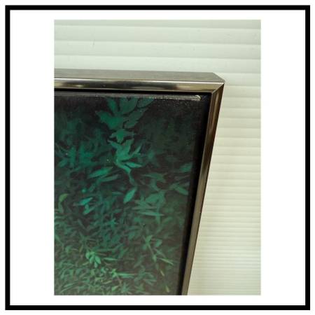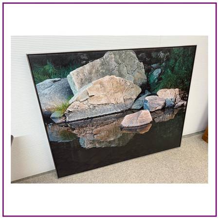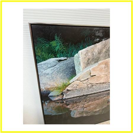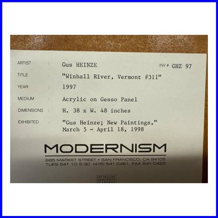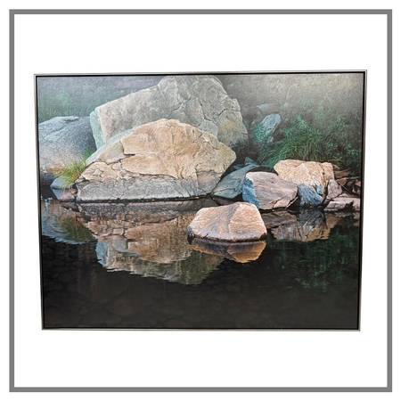 Design Plus Gallery presents Winhall River, Vermont by Gus Heinze, Signed + Dated 1997.. The artwork is considered a photorealistic painting with a realistic look at the slack tide in the river. There is delicate foliage + ancient rocks reflecting off the dark water, up to the finest detail. Crisply encased in thin metal frame. Condition is good with minimal signs of use for its vintage age.