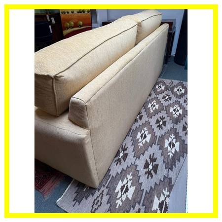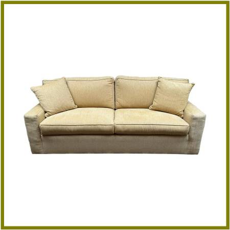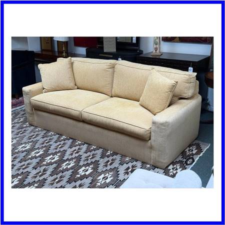 Design Plus Gallery presents the Erin Sofa Customized in Chenille by Coleman of California. The sofa has been wrapped in gold chenille with self welt detail. You should find the seating comfortable as the sofa has foam filled loose back + seat cushions. Its durable texturized fabric is a poly blend for long wear + comfort. Two matching throw pillows of same fabric are included. Light wear; condition is good for age and use.