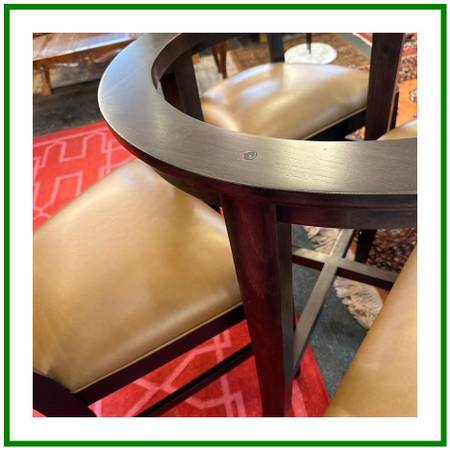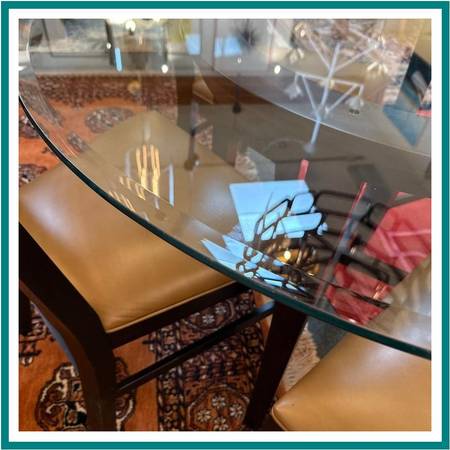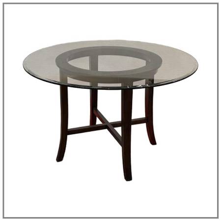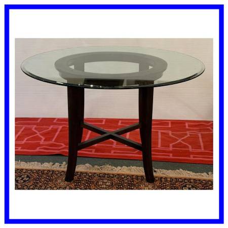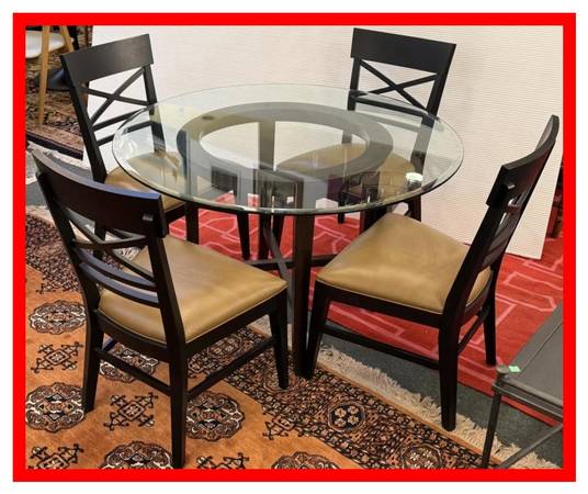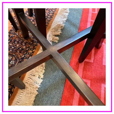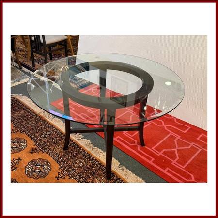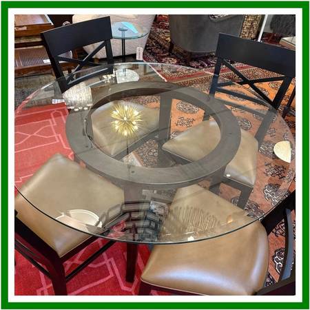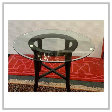 Design Plus Gallery presents the Halo Dining Table and Four Blake Chairs from Crate Barrel. The table offers a circular glass top that is supported by a unique openair wood base. Two crisscrossing stretchers connect all legs to the pedestal base.Overall the table is in good condition for its usage.