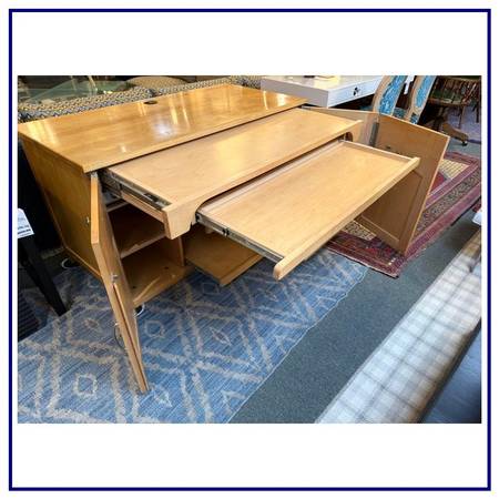 Design Plus Galley presents an All in One Compact Desk from Creative Ideas. This desk is deceiving, in the best way. It has the look of a console that opens up and expands into a fully operating office. There are two doors with the right one folding in on itself and they open to reveal two desk tops that slide out, a circuit breaker for cord control, modular shelving insets, two deep drawers, and two center shelves that mimic the table tops and also slide out. Visible wear is present to the piece and its condition is fair for its usage.